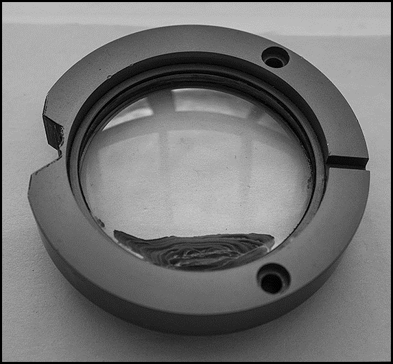 Nach einigen Stunden nahm ich das Objektiv heraus und reinigte es mit Waschbenzin. Es sah völlig unverändert aus. Die Delamination war noch vorhanden.