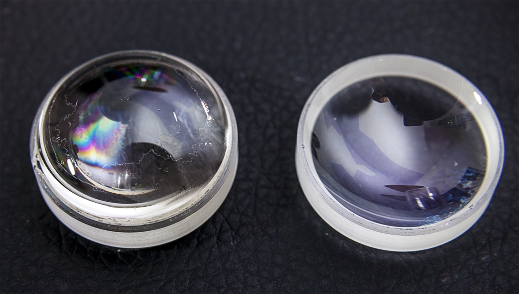 Aber so kann sicher relaminiert werden. Kittreste (links zu sehen) noch entfernen, dann NOA in die Mitte einer Linse, andere Linse drauflegen (hier werde ich eine Hülse nehmen,