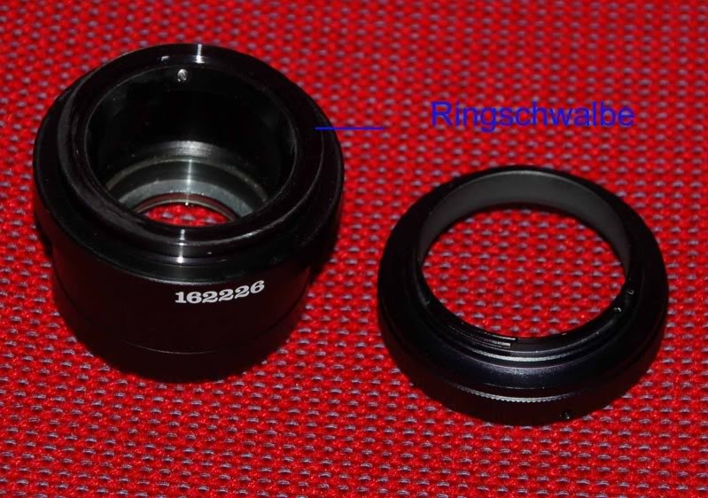 Dann läßt sich auch ein Nikon-T2-Adapter draufdrehen. Oder du schraubst bei dem den Gewindeeinsatz raus und steckst das Nikonbajonett drauf.