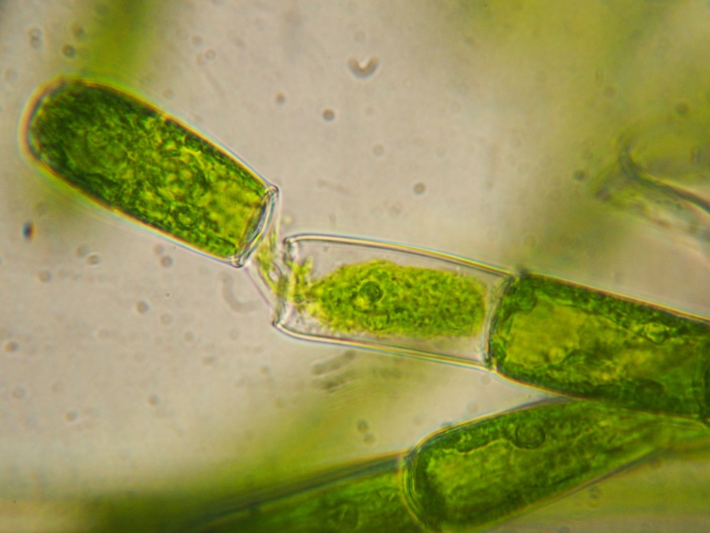 100er Öl Objektiv eines ,,Schülermikroskops", von Schülern der 10. Klasse. Alge aus dem Schulaquarium, auf dreckigem Objektträger mit dreckigem Deckglas bei voller Raumbeleuchtung aus der Hand durchs Okular fotografiert (eben Schulbetrieb). Kein Bild zum stolz sein, aber es zeigt die Leistungsfähigkeit des Olympus Systems.