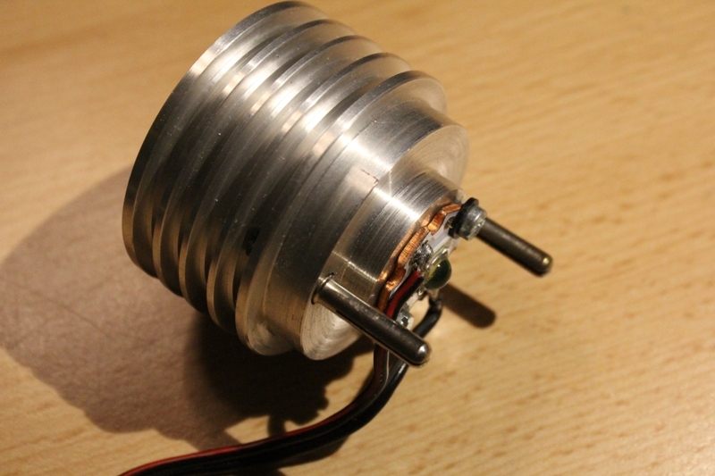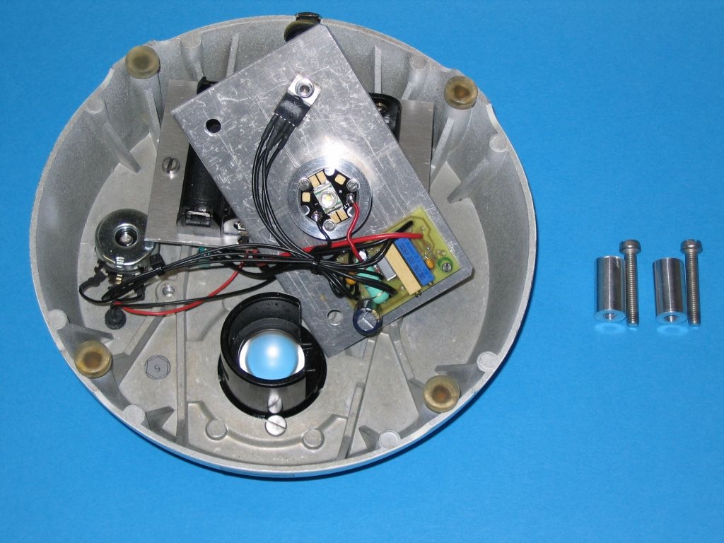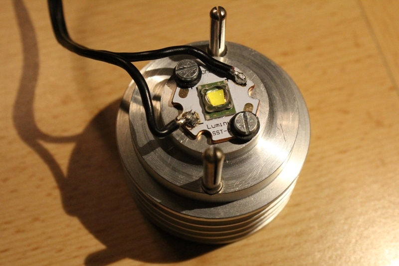 Meine letzten Versuche mit der LED liegen etwas zurück und aus Zeitgründen habe ich sie dann nicht zuende geführt. Eine Halterung aus Alu habe ich mir bereits mit Hilfe eines netten Kollegen hergestellt. Die kann anstelle des Lampenhauses eingesteckt werden.