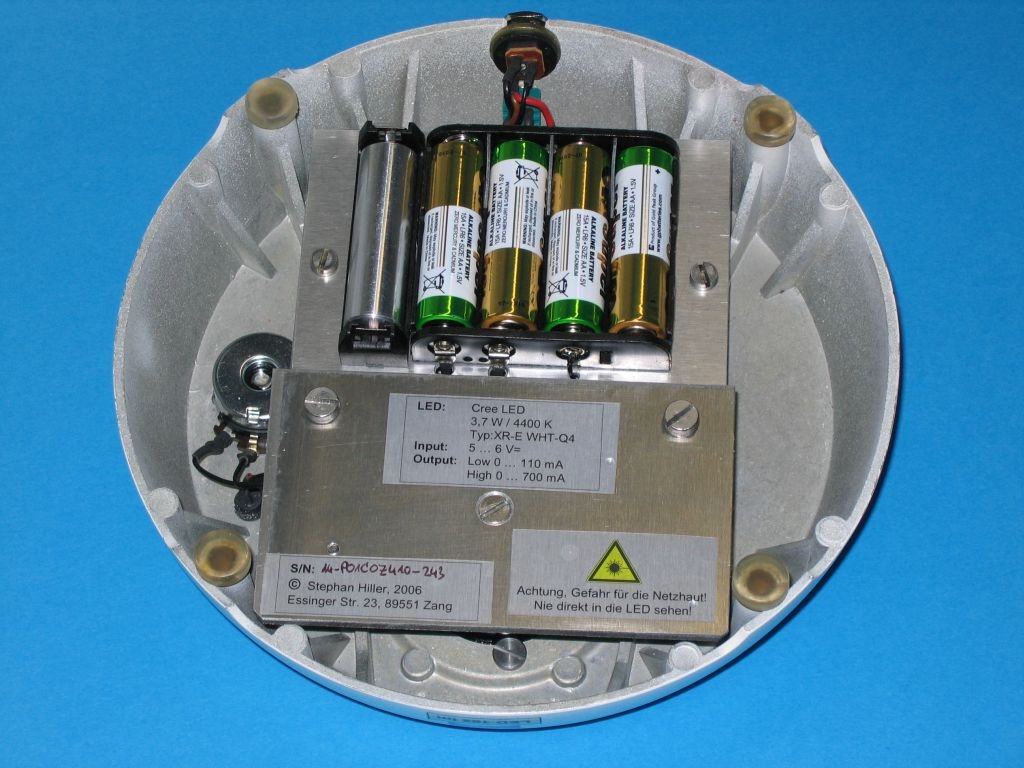 Umbau auf LED (mit Cree XM-L2 10 W LED) mit massivem gedrehten LED Kühlkörper angekoppelt an das interne Aluminiumkühlgehäuse. Die LED kann problemlos bis zu 3 A bestromt werden, ohne dass eine Gefahr der Überhitzung besteht. Farbtemperatur der LED nach Wunsch (3000K - 6500K). Die Lichtleistung des auf LED umgebauten Lampenhauses ist höher als die der originalen 100 W Halogenlampe.