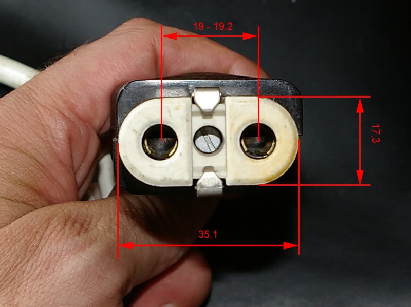 Die Löcher für die Kontaktstifte im Stecker haben einen Durchmesser von min. 7,2 mm und haben innen federnde Kontaktzungen, die den Kontaktstift, der nur ca. 6 mm Durchmesser hat, sicher kontaktieren. Wie gut, wenn man so ein altes Zeugs nicht wegwirft ;D ;D ;D