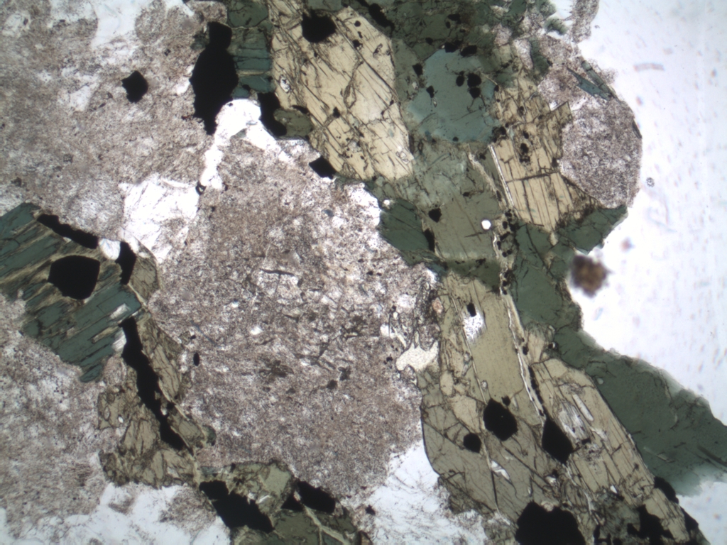 Ich  habe z.Zt. nur eingeschränkten Zugang  zum Netz, und auch  nur in schlechter Qualität, daher in aller  Kürze. Ich sehe keinen Staurolith, aber Amphibol, Titanit und Feldspaete sind eindeutig. Was Du als Staurolith zeigst scheint  mir nur ein vergammelter Kalifeldspat zu sein. Vom Gefuege her halte ich das Gestein für  einen Diorit und keinen Metamorphit.