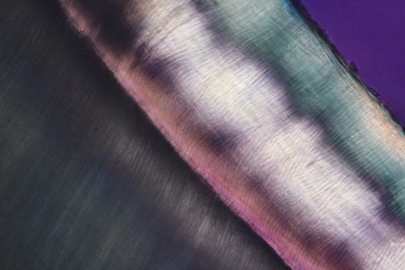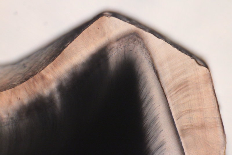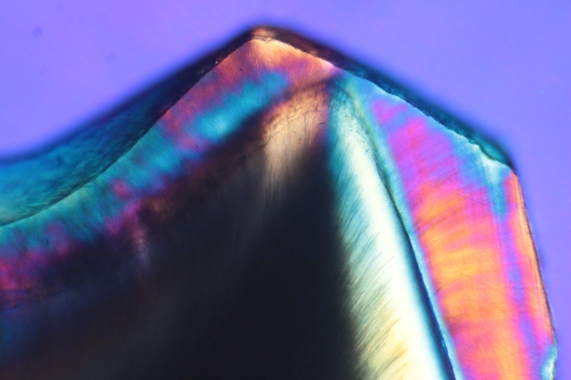 Und hier nun ein paar Mikroskopaufnahmen. Als erstes eine der 3 Spitzen. Deutlich erkennt man die Trennline zwischen Zahnbein (Dentin) und Zahnschmelz. Erstes Foto Hellfeld, zweites x-Pol mit Rot-I-Schieber: