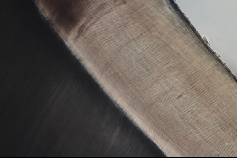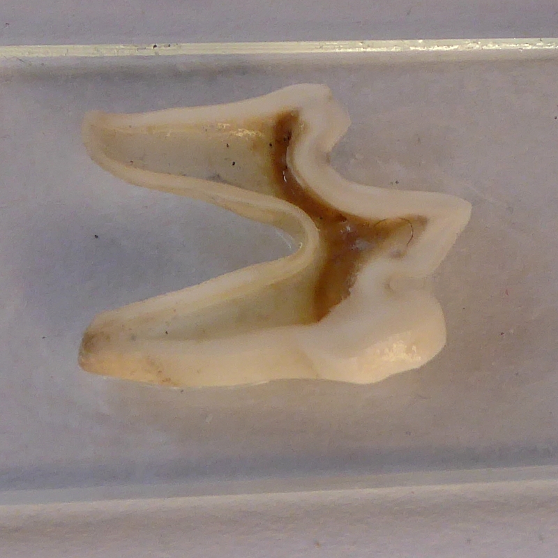 also unsere eigenen Zähne sind nicht sooo hohl. Deshalb hat es mich schon ein wenig überrascht, wie wenig Zahn da zum Schluß auf dem Objektträger klebt. Aber ein Fuchszahn ist wahrscheinlich auch nicht für 60 Jahre+ gebaut, sondern höchstens für 10..15 und mit ihm wird nicht gemahlen, sondern ausschließlich zerrissen. Das ist sicher der wesentlichste Unterschied.