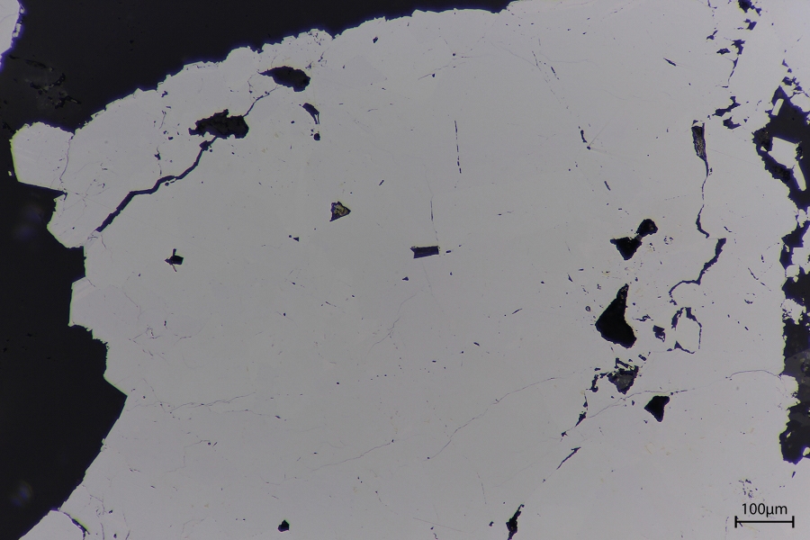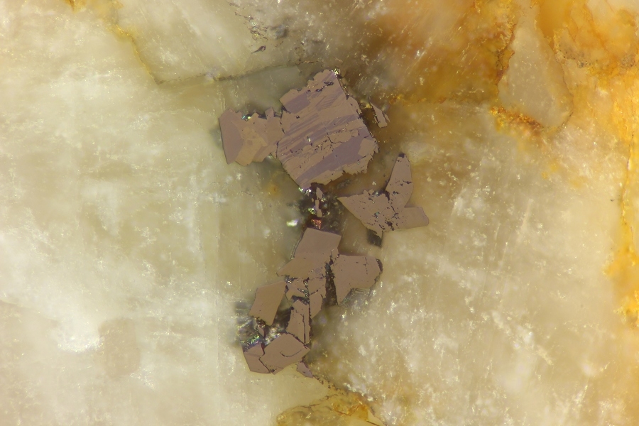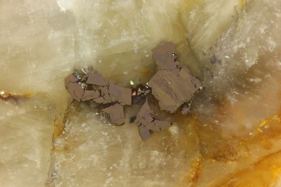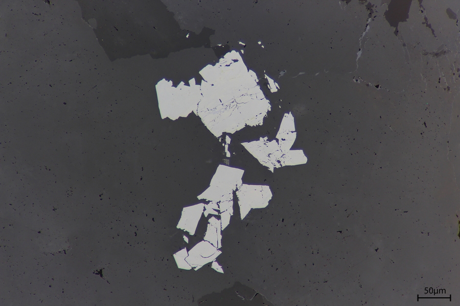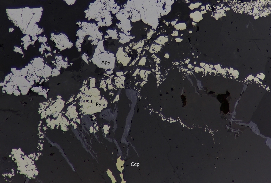 Im Anschliff ist Arsenopyrite weiss. Die Typische Anisotrophie Farben weisen schon richtung Arsenopyrite.