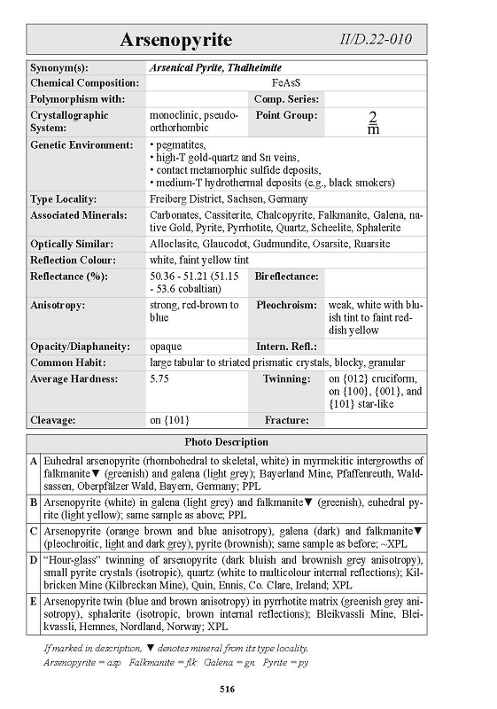 General data. Chem. FeAsS, but always with small Co-content, which may go up to Fe:Co = 2:1 ( ~ 12% Co) in "Danaite"; in "Glaucodot" even up to Fe : Co = 1:6. All intermediate members seem to occur, but high Co-contents involve such strong deviations that a separate treatment is justified. Appreciable As-excesses as reported in earlier papers are mostly due to intimate intergrowths with löllingite, while a small As-excess seems to be due to vacancies of a few Fe-positions in the lattice.
