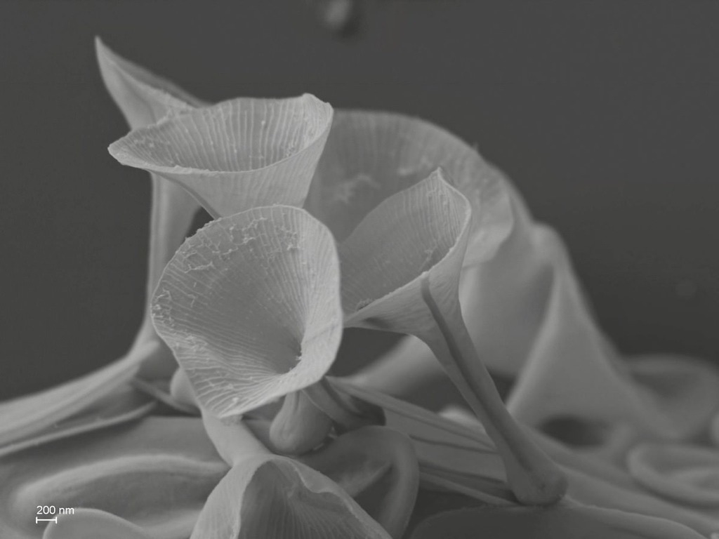 Dies sind Schuppen/Nadeln des Sonnentierchens Pseudoraphidocystis glutinosa (Penard 1904) Mikrjukov 1997. Im Lichtmikroskop sehen diese schuppen wie ein langes "Y" aus. Technische Daten der Aufnahme: 2kV Beschleunigungsspannung und 6 mm Arbeitsabstand.
