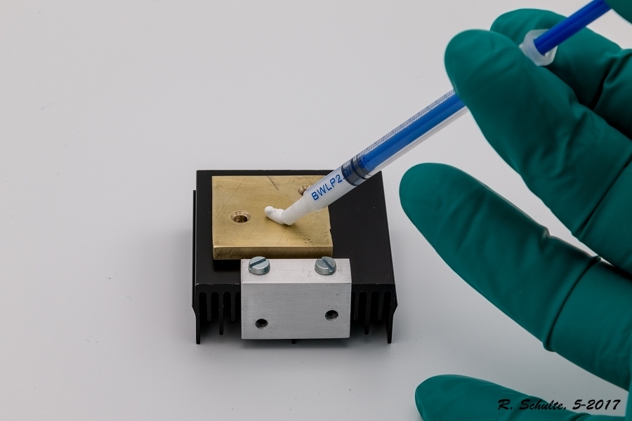 Bei die Endmontage wird Wärmeleitungspasta genutzt. Diese Pasta behebt den Luftspalt zwischen die Messing Platten. Die Wärme kann jetzt besser weiter geleitet werden zum Kuhl Körper. Pasta habe ich bezogen von Conrad. Gibt es in Deutschland auch.