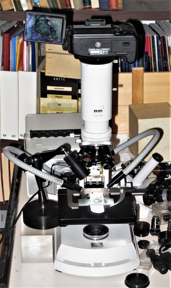 Die Kamera habe ich direkt aufgesetzt über CZ-Ringschwalbe-EOS-Bajonett oder mit einem Zwischenteil aus meiner Kiste (war früher für Videoadaption.) Das gibt dann eine deutliche Nachvergrößerung durch den größeren Abstand.