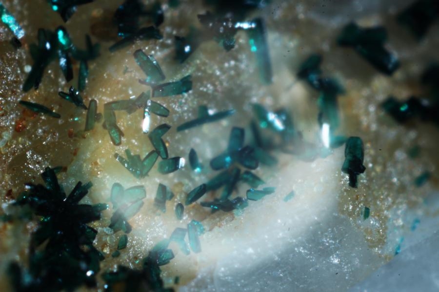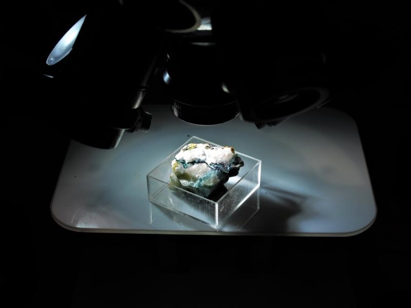 Meine Mikromounts sind fast alle in Döschen mit einem dauerplastischen Kitt montiert. Zum Vergleich: die Innenmasse 25 mm². Damit hat man eine Vorstellung der Dimension der kleinen Fläche mit den Kristallen. Hier Klinoklas.