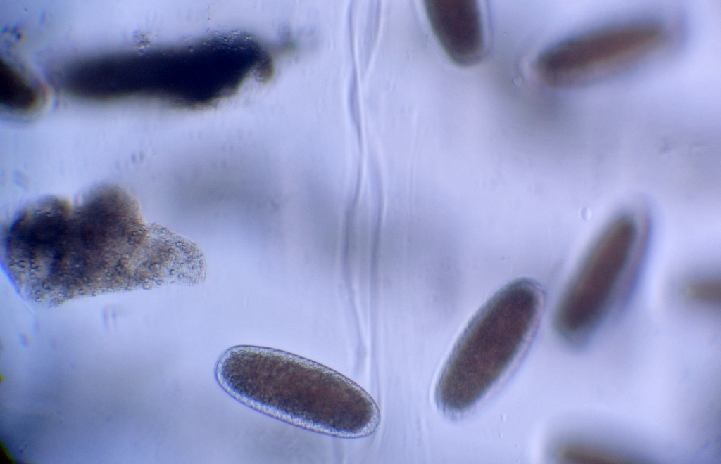 Gesamtlänge ca. 12mm, es schienen mehrere aneinander zu hängen. Konsistenz gallertartig mit geometrisch angeordneten Ei-förmigen Teilen. Die Fotos zeigen das Ding einmal komplett (gestackt mit dem Stemi), dann einen Ausschnitt bei 225-facher Vergrößerung, der die Ei-förmigen Objekte besser zeigt. Kann mir jemand sagen, was das ist?