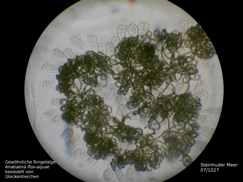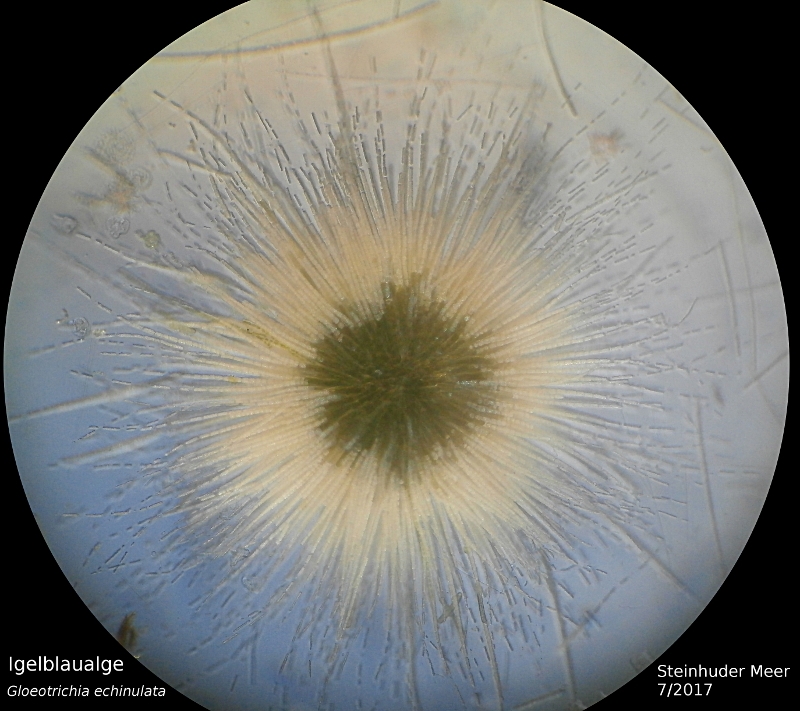 Dem musste ich natürlich nachgehen und fand auch eine reiche Blaualgengemeinschaft. Die großen Kugeln der Igel-Blaualge kann man schon mit bloßem Auge sehen: