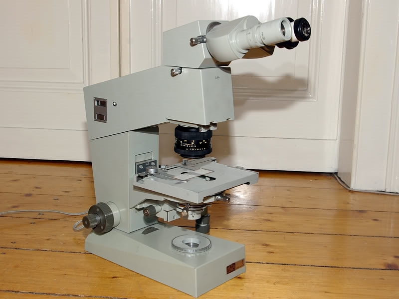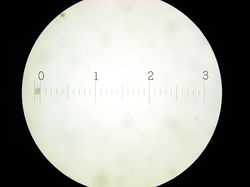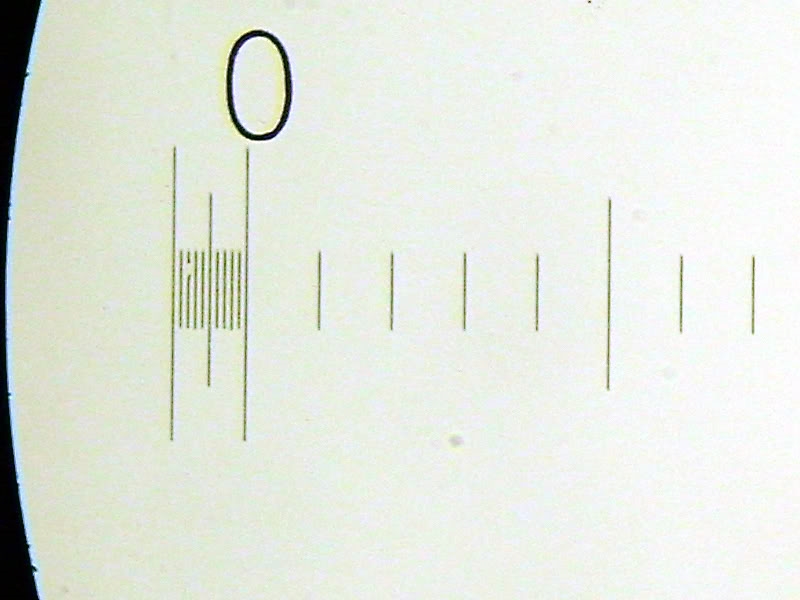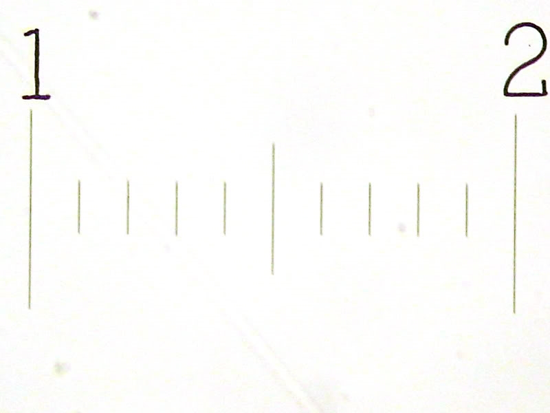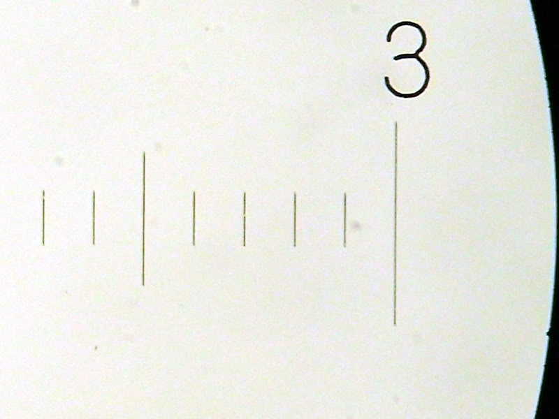 Aufbau: Vertival, Hillersche LED, Kondensor mit langer Schnittweite Apertur 0,6, Großfeldlinse im Strahlengang, Mattglas (Nähe Leuchtfeldblende) im Strahlengang, Objektiv Rollei Planar 1,4/50 am Schlitten in Retrostellung montiert, Okulare visuell CZJ P10x (20), fotografiert durch Okular CZJ GF-P10x (18) Brille im rechten Stutzen mit Rollei Kompaktkamera RCP-8325 (8MPixel) in Motivstellung "Berge", automatische Belichtung, Kamera ambulant vor das Okular gehalten wegen fehlender starrer Verbindung, Motiv CZJ Objektmikrometer (3,1 mm) und histologischer Schnitt (Konisation) unbekannter Herstellung, jeweils Fokusreihen (Feintriebverstellung um je 2 Skalenteile) und Auswahl des schärfsten Fotos, bearbeitet mit Photoshop LE jeweils nur Weißabgleich