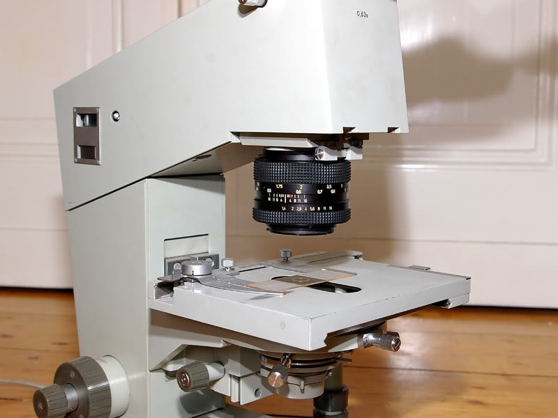 Natürlich nicht an einem üblichen Mikroskop, sondern an einem stabilen Stativ. Die einfachere Version wäre ein Balgengerät :-))