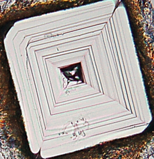 Daß man die Stufen überhaupt lichtmikroskopisch erkennen kann, habe ich noch nicht ganz verstanden. Nach Lehrbuchzeichnung legt sich Atömchen für Atömchen an eine Stufe an und baut sich ins Kristallgitter ein. Das dürfte wegen der Stufenhöhe in atomaren Dimensionen aber lichtmikroskopisch nicht erkennbar sein. Nach dem schon zitierten Forty wäre die minimale Schichtdicke 0,683 nm, die gemessenen Stufenhöhen liegen bei einem Vielfachen dessen zwischen 8 und 48, d.h. zwischen 5,6 und 32,8 nm, ja bis zu 200 nm wurden beobachtet.