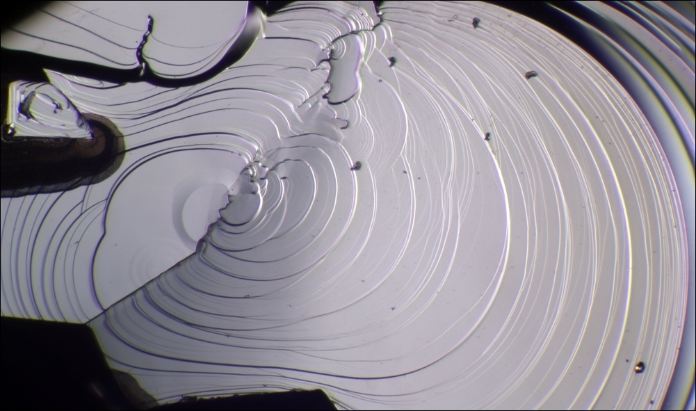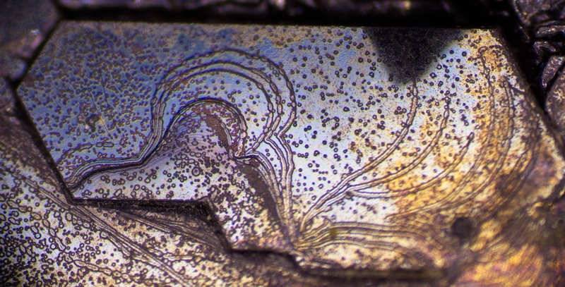 Olafs Carbid-Kristall ist ,,kristallgewordene Spirale". Von makroskopisch bis etwa 200fach sind die Stufen abbildbar. Ein optischer Genuss, wenn kantige Kristalle sich in Kurven auflösen ...