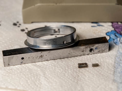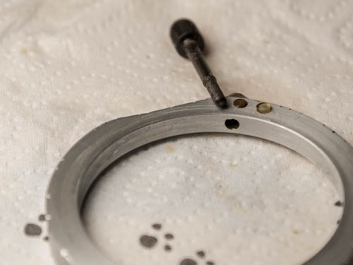 Der Flanschring erfordert einen Stirnlochschlüssel mit ca. 55 mm Öffnungsweite (Universalstirnlochschlüssel mit entsprechendem Bereich wäre empfehlenswert.) Da meinem Fundus ein solcher fehlt und alle improvisierten Versuche fehlschlugen musste größeres Geschütz her: In ein Halbzeug aus der Restekiste habe ich an der Hobbyfräse zwei Löcher gebohrt, in einem leichten Winkel. Zwei HSS Bohrer dienten anschließend als Stifte. Das Metallstück könnte ich nun über die im Flansch steckenden Bohrerschäfte drücken und somit zu einem System verspannen. Das Metallstück in den Schraubstock eingespannt, ließ sich die Verschraubung mit ordentlichem, aber sanftem, Druck lösen.