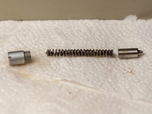 Der Tisch wird mit einer federnden Hülse und zwei Schrauben zentrierbar gelagert, Feder, Hülse und Dorn waren ebenfalls mit altem Fett völlig verbacken, da half nur noch Aceton. Es ist ratsam zuerst die Feder einzuschrauben, diese zentriert den Tisch dann quasi vor wenn die beiden Einstellschrauben eingebracht werden.