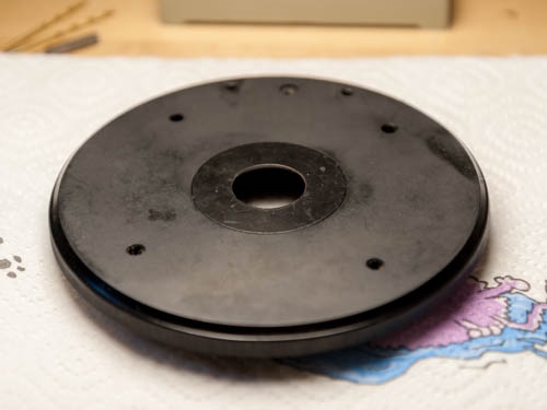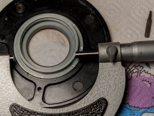 Der Gleitring bildete zusammen mit dem Tisch eine Passung. Hier dreht sich nichts, kein Schmierstoff dieser Welt könne daran etwas ändern. Leider habe ich keine Innenmessschrauben und konnte somit nur den Außendurchmesser der Gleitbahn am Tisch bestimmen. Der Tisch lässt sich auf einer kleinen Hobbydrehbank mit Dreibackenfutter auch leichter spannen. Ferner drehe ich lieber am OD als am ID, den noch fehlenden Messschrauben geschuldet. Den Tisch vorsichtig(!) eingespannt und drei hauchdünne Schnitte später hatte ich die gewünschten Abmessungen erreicht. Der Ring passte auf Anhieb, kein Spiel, dreht butterweich auf dem Ölfilm zwischen den Oberflächen. Es waren am Ende nur 2/100 mm, aber der Unterschied ist gewaltig.