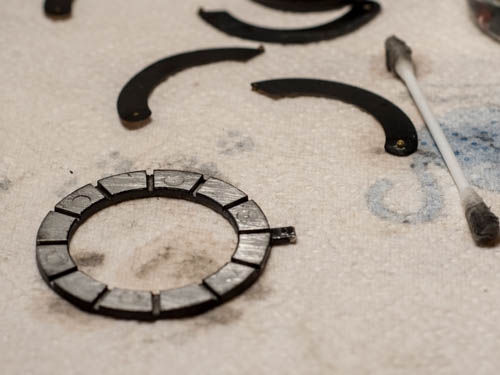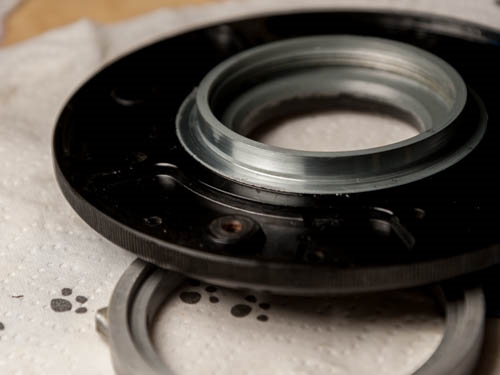 Die Blendenlamellen wurden vorsichtig voneinander geschoben und in Alkohol gebadet abschließend mit einem Wattestäbchen gereinigt. Beim Zusammenbau ist Geduld gefragt. Ich hatte mich grob an die Anleitung aus der Infotheke gehalten, die Pins aber mit dem Schraubendreher in die Aussparung des Einstellringes bugsiert anstelle die Lamellen im Vorfeld richtig auszurichten. Ob der Verwendung von Handschuhen und diverser (kleiner) Wutausbrüche, konnte ich diesen Teil leider nicht mit der Kamera festhalten.