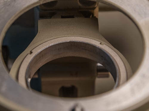 Weiter zum Grobantrieb: Ebenfalls verkrustetes Fett welches die Mechanik schwergängig macht. Das messingfarbene Zahnrad ist zur leichten Positionierung gestiftet und verschraubt, es lässt sich mit seinem Lagerblock nach oben herausnehmen. Die Achse des Zahnrades ist konisch und auf der verjüngten Seite mit einem Gewindestift fixiert. Auch hier sollte man Zerlegen und Zusammenbauen genauer hinsehen. Ebenfalls entfettet, gereinigt und neu geschmiert. Ein schönes Detail: Die Zahnstange war unterlegt um die Eingrifftiefe zu optimieren.
