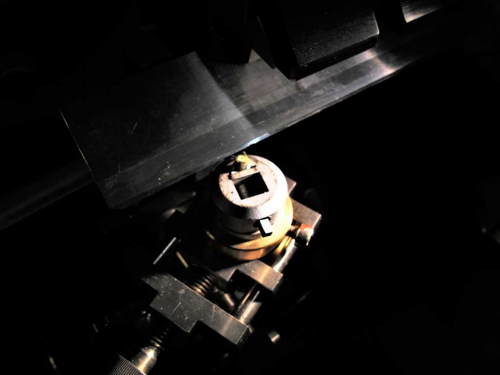 Ein Federdraht unter der Deckplatte drückt die Probe an die Kante. Die Klingenschneide liegt auf der Platte auf.