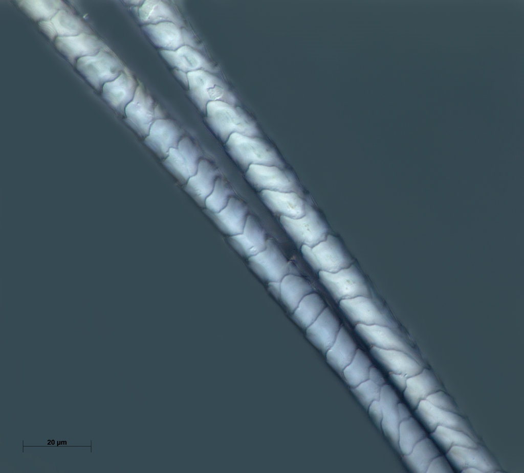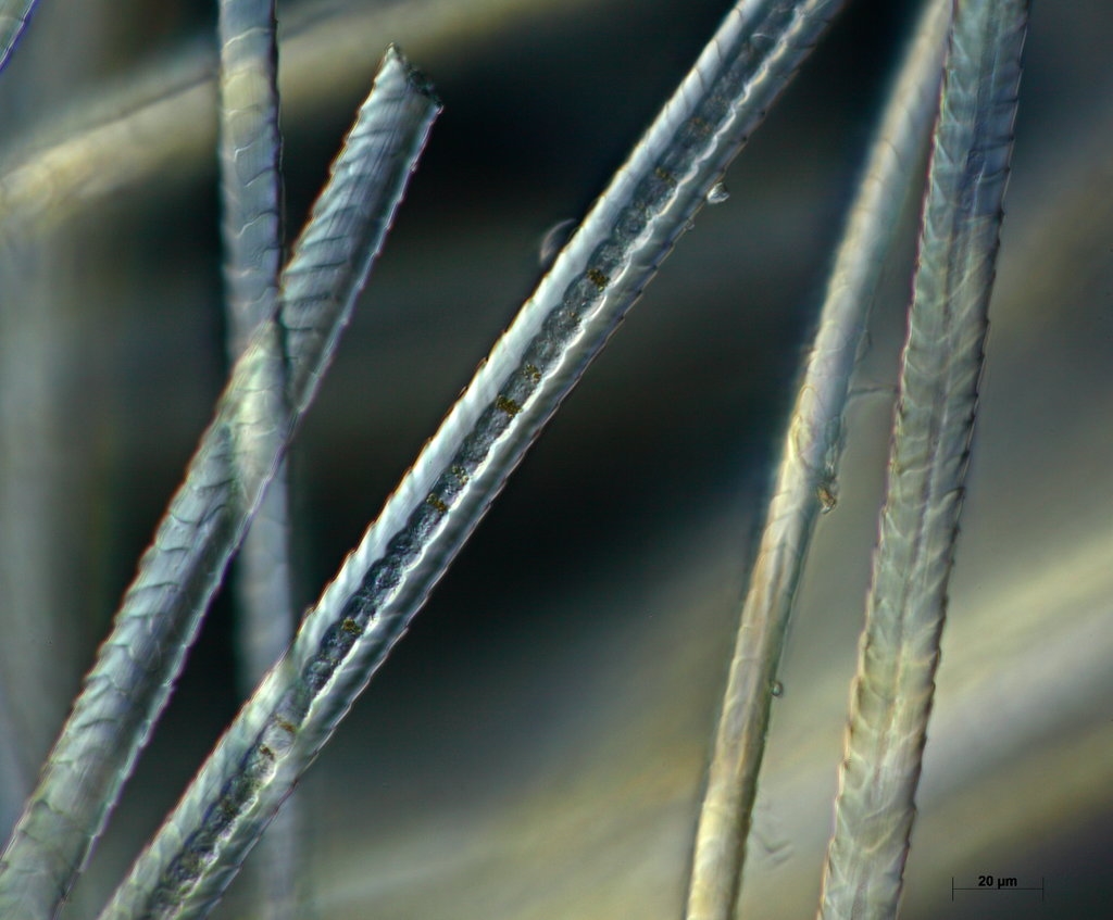 Es handelt sich um weiße Haare, weder im Hellfeld noch im Dunkelfeld bekam ich eine schöne Ansicht der Schuppenstruktur.