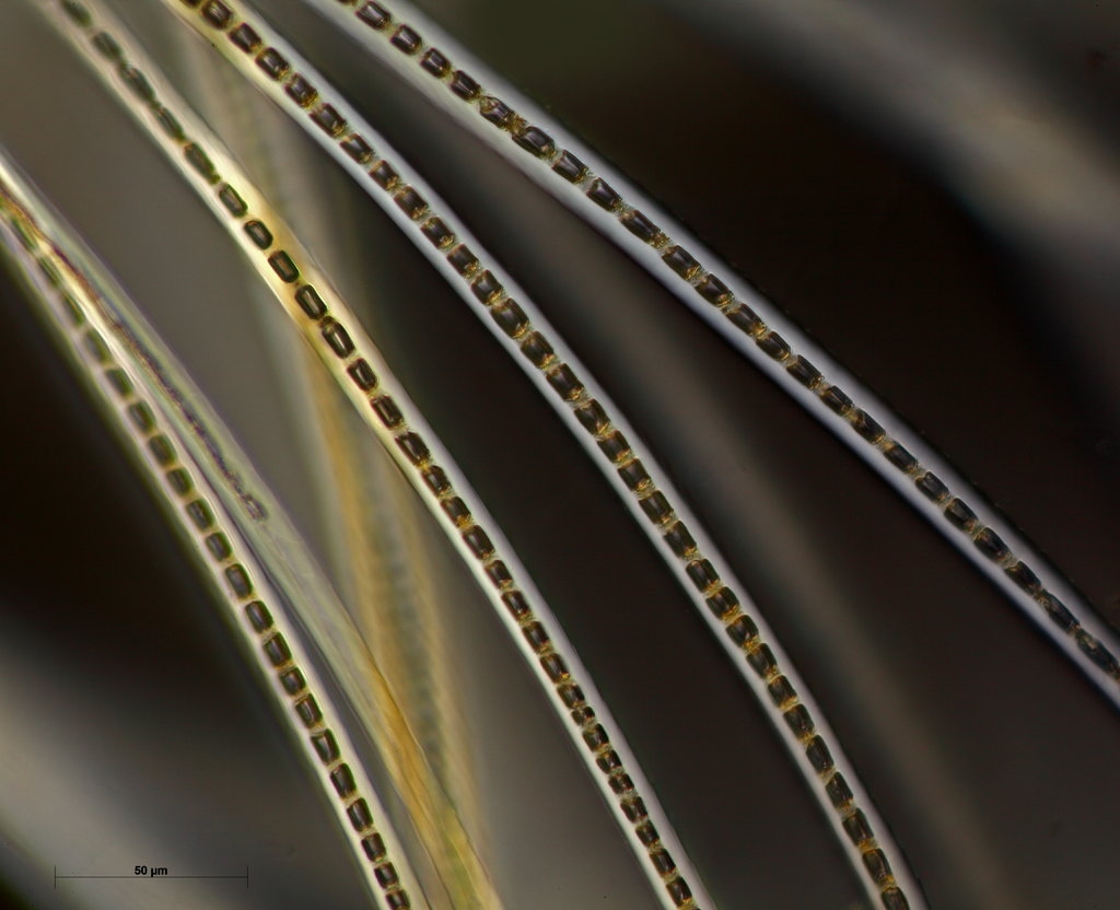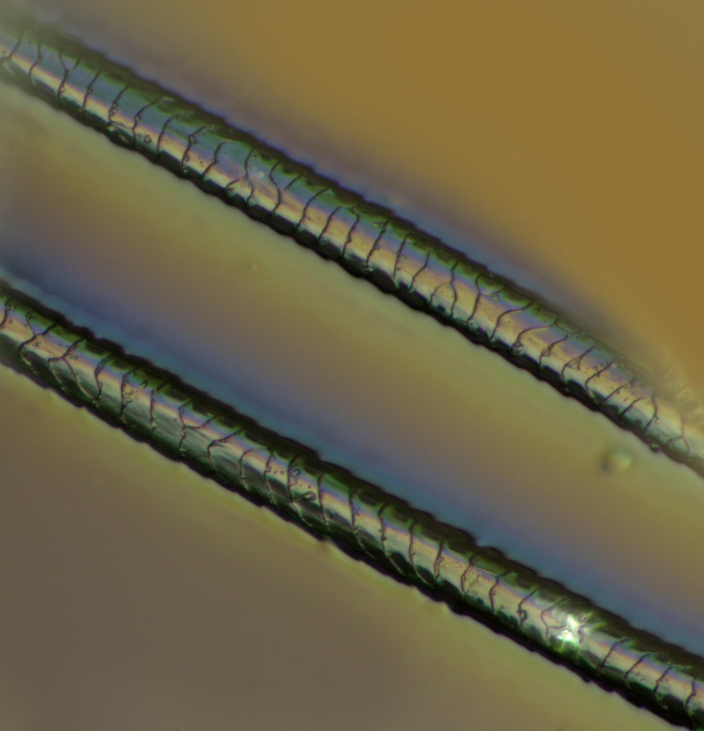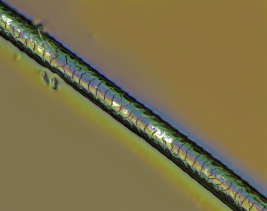 Gibt man die Haare in Wasser, kann die Schuppenstruktur auch im Durchlicht-DIC gut erkannt werden, das Fotografieren ist jedoch trotzdem schwer, hier zwei Versuche.