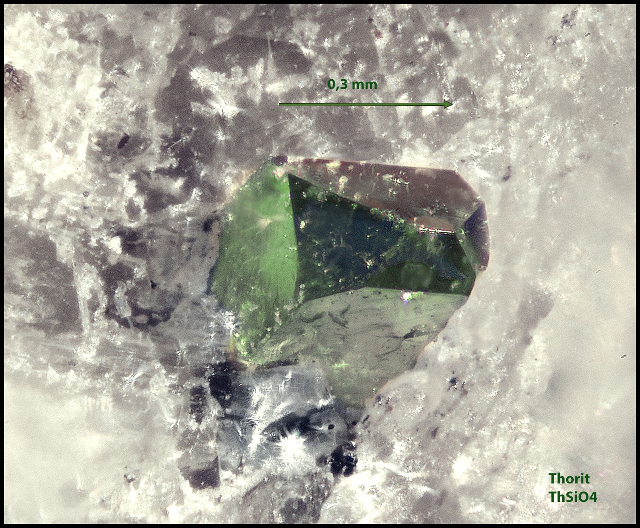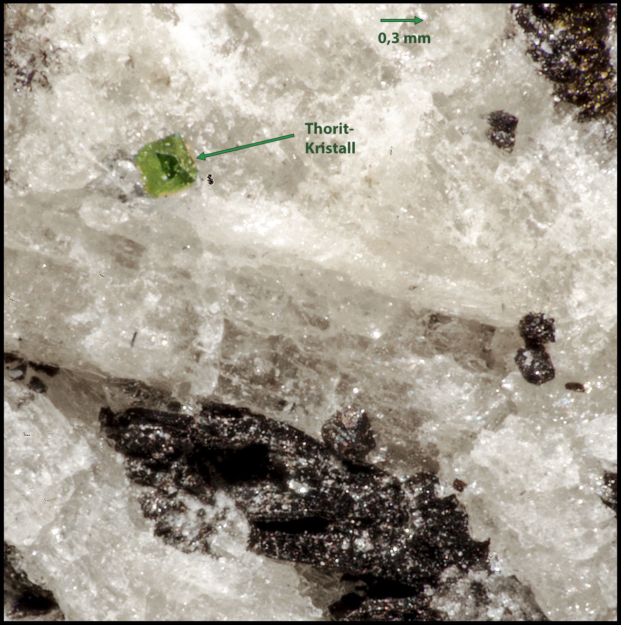 Anbei eine Übersichtaufnahme des Thorit Kristalls in der Feldspat Matrix: