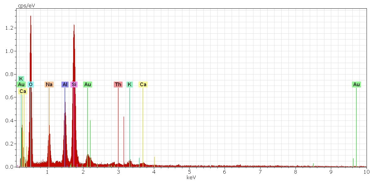 Das EDX Spektrum aus der Feldspatmatrix neben dem Thoriumkristall mit den im Feldspat vorkommenden Elementlinien : Si, O, Al, K, Na, Ca: