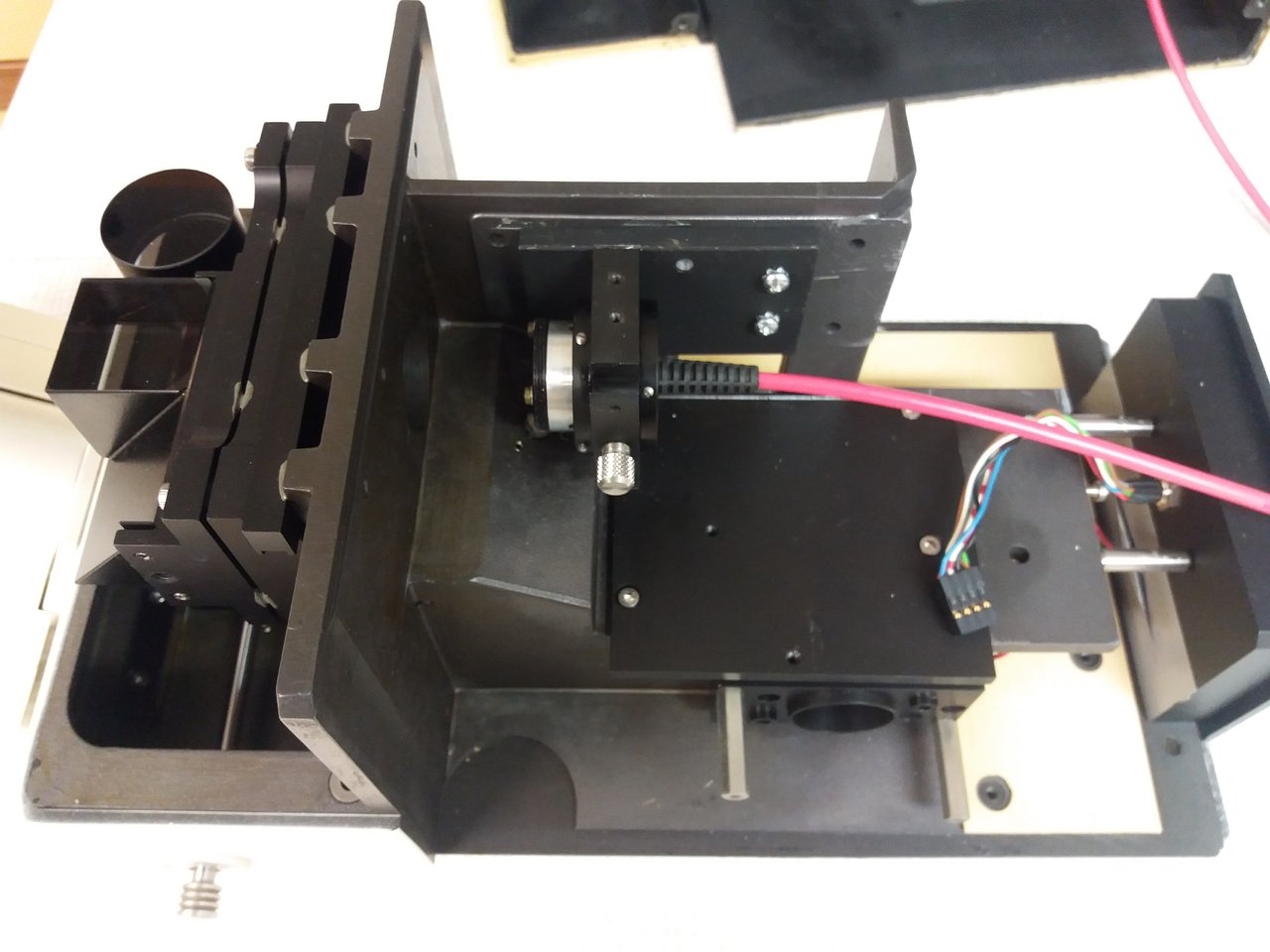 Das rote "Kabel" ist der Lichtleiter zum Spektrometer, das Ende des Lichtleiters ist mit einer x,y,z-Positioniereinheit zentrierbar und exakt in die relle Zwischenbildebene positionierbar. Für ein hochauflösendes Spektrometer ist kein Platz. Leider ist mein Zeiss-MCS-Diodenarray für Raman ungeeignet, zu wenig Auflösung (2 nm) und zu unempfindlich.