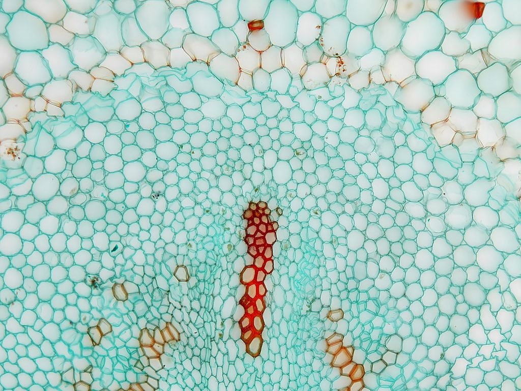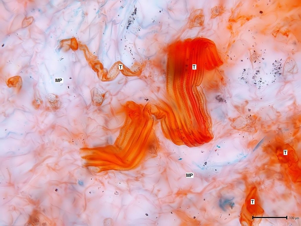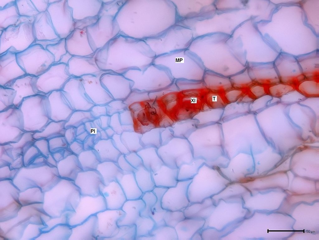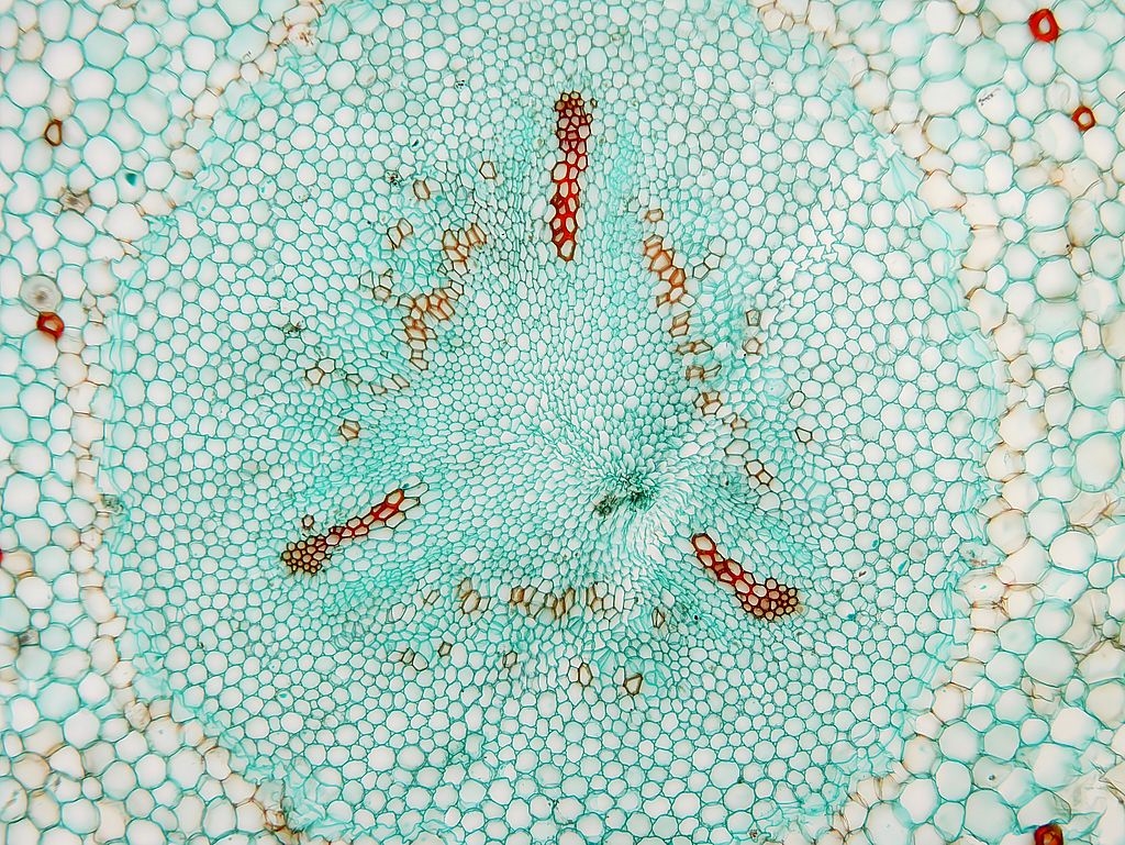 Wir finden eine fingerartige Anordnung der Tracheiden vor, klassische monokotyledone Leitbündel lassen sich nicht entdecken. Die Tracheiden verlaufen sowohl senkrecht zur Schnittebene als auch quer. Phloemzellen sind bei dieser Vergrößerung nicht erkennbar.