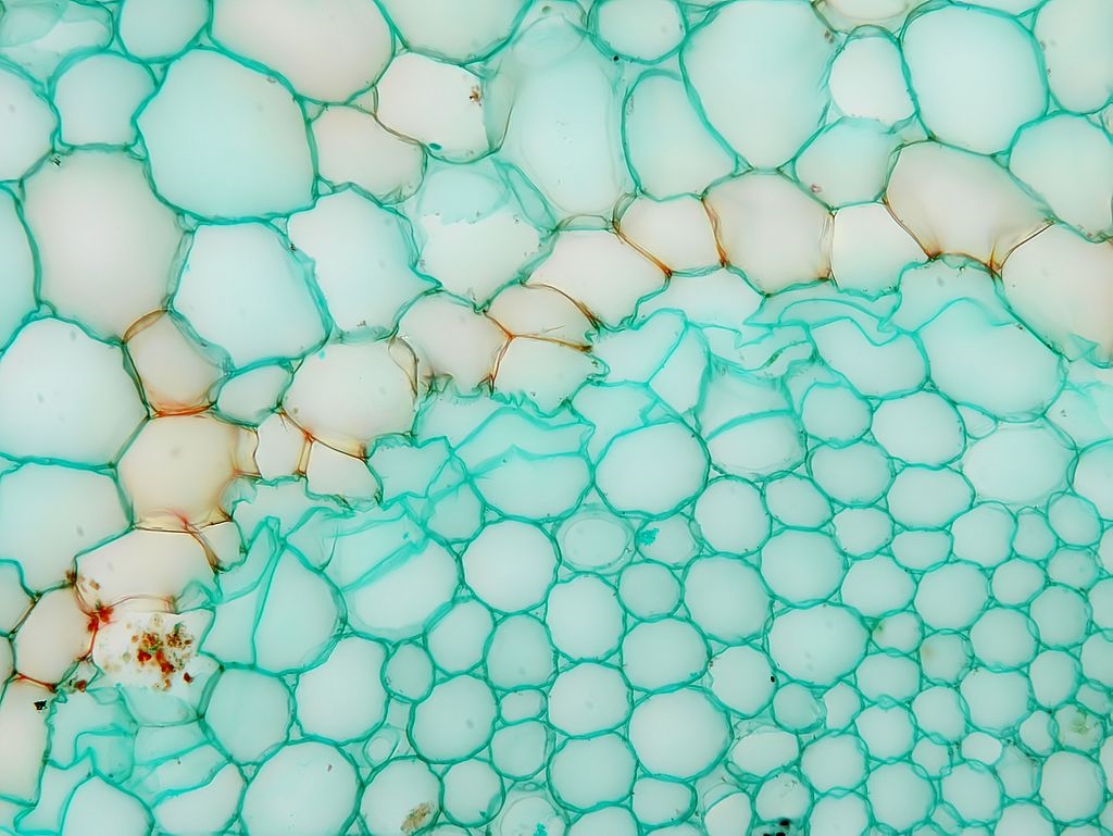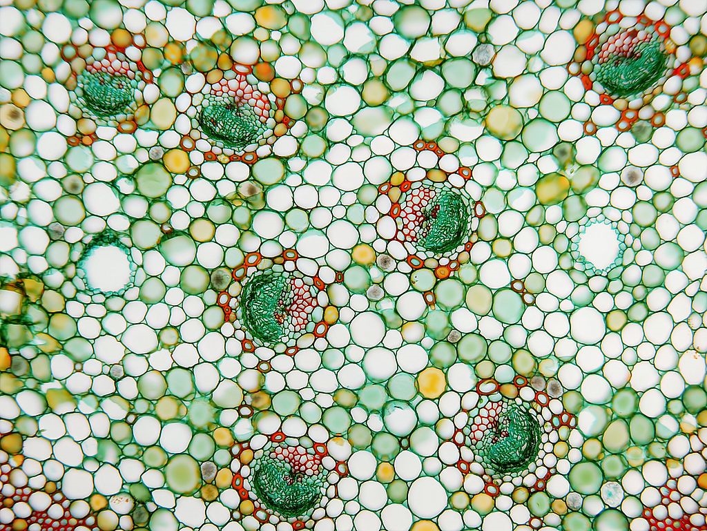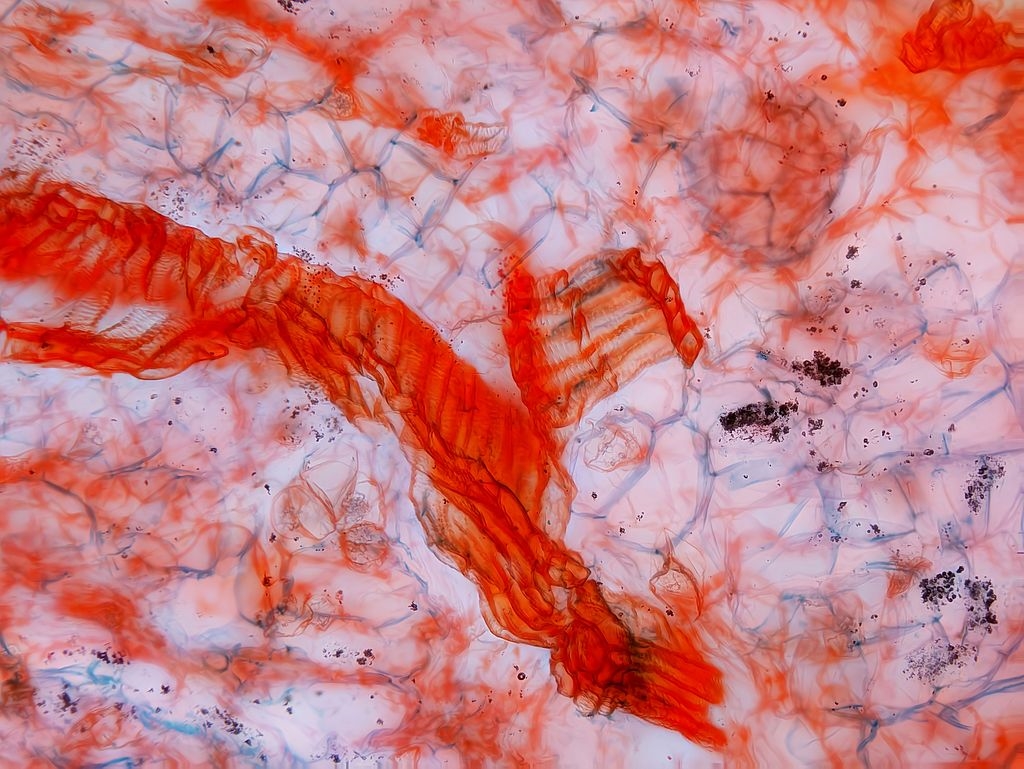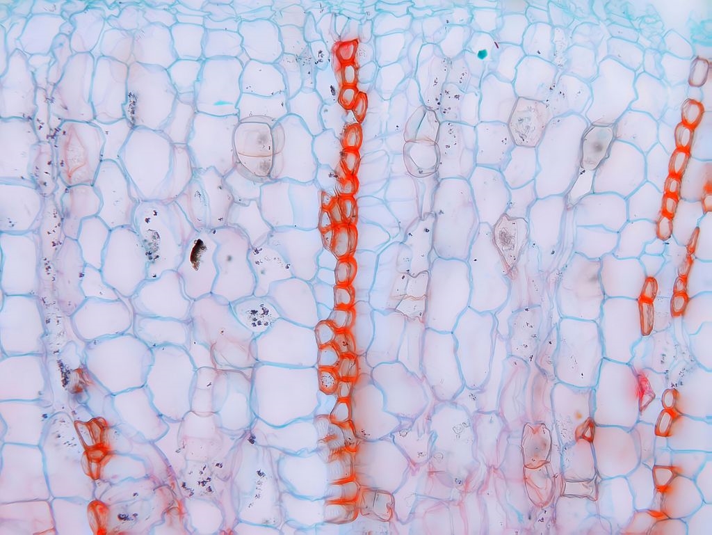 Wir finden eine fingerartige Anordnung der Tracheiden vor, klassische monokotyledone Leitbündel lassen sich nicht entdecken. Die Tracheiden verlaufen sowohl senkrecht zur Schnittebene als auch quer. Phloemzellen sind bei dieser Vergrößerung nicht erkennbar.