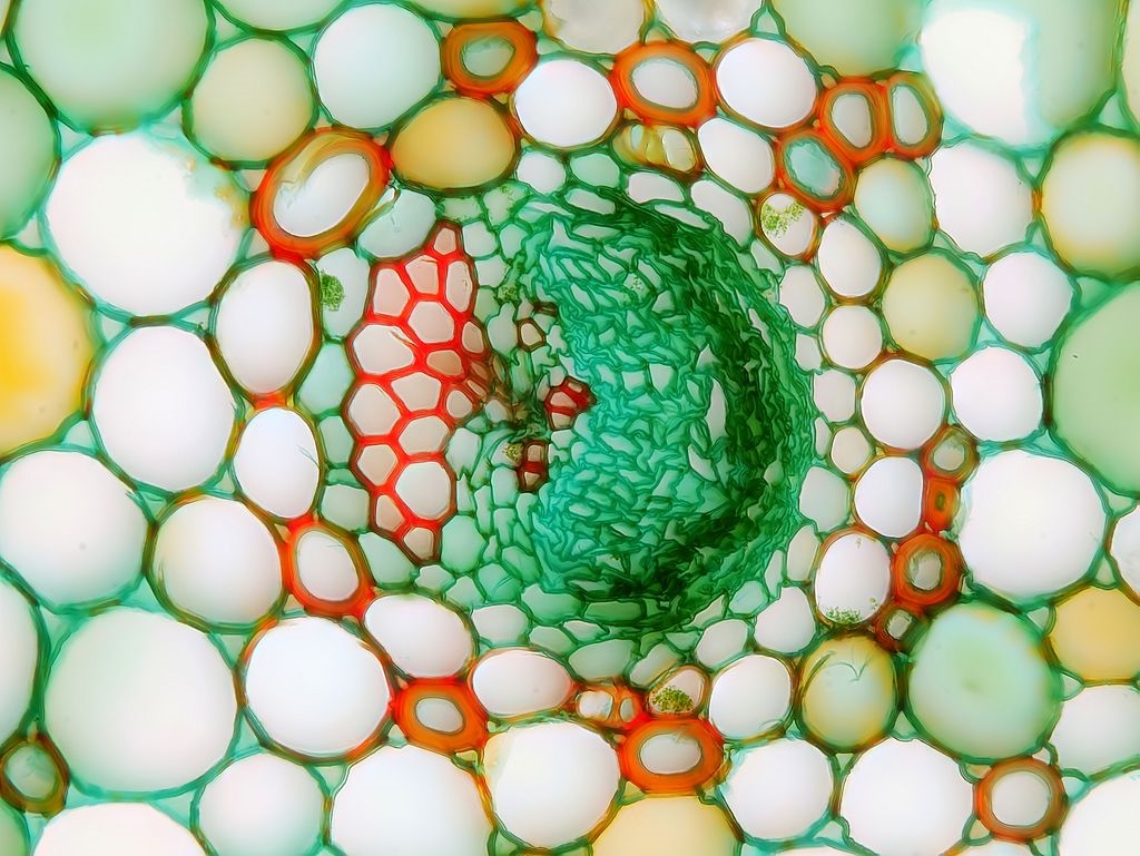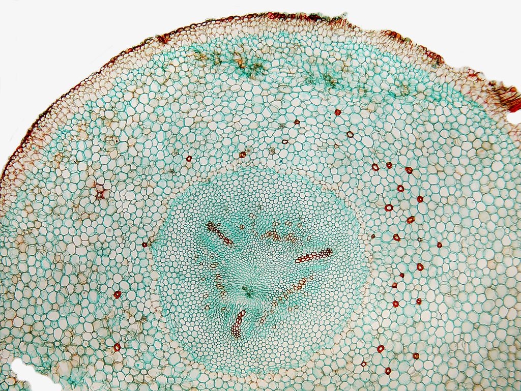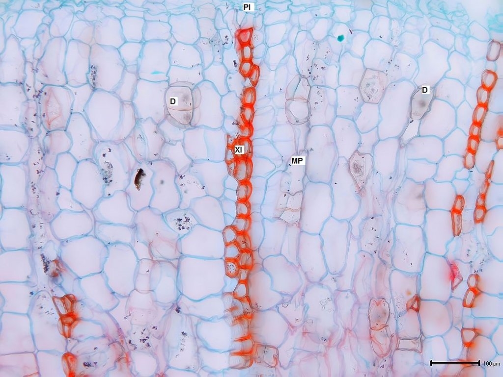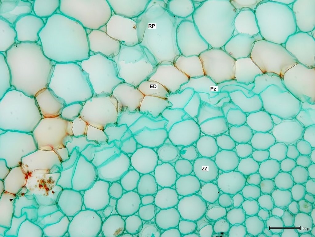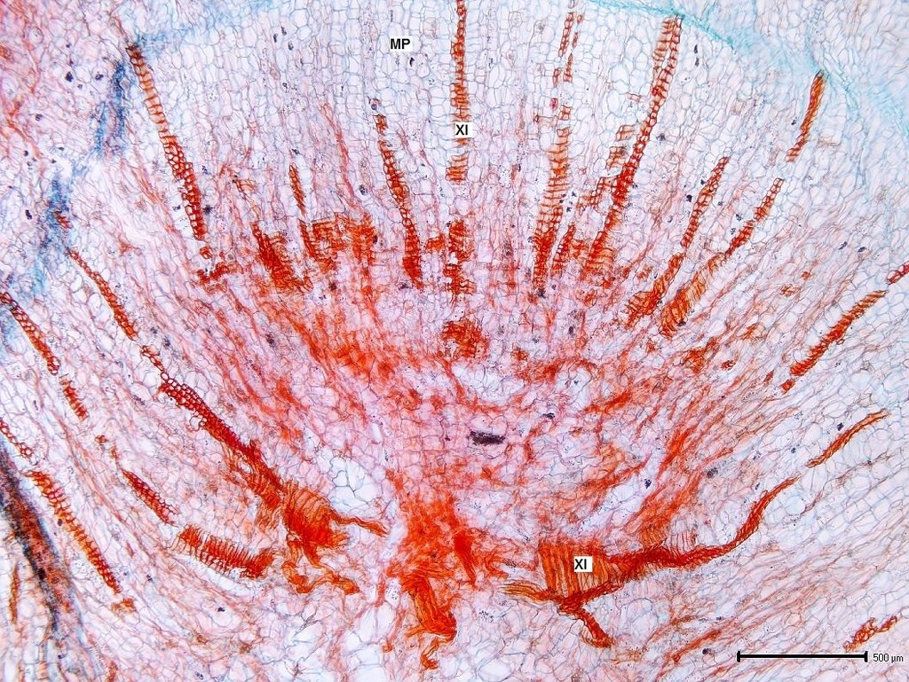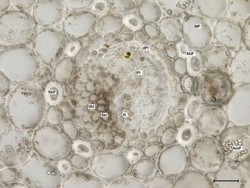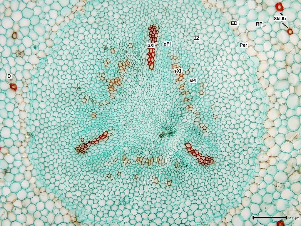 Wir sehen den klassischen Aufbau einer triarchen Wurzel mit primärem und sekundärem Xylem und Phloem im Zentralzylinder, der von einem Perizykel und der Endodermis umschlossen ist. Weiter außen folgt die Wurzelrinde mit eingelagerten sklerenchymatischen Idioblasten, den Abschluss bilden Rhizodermis und Exodermis.