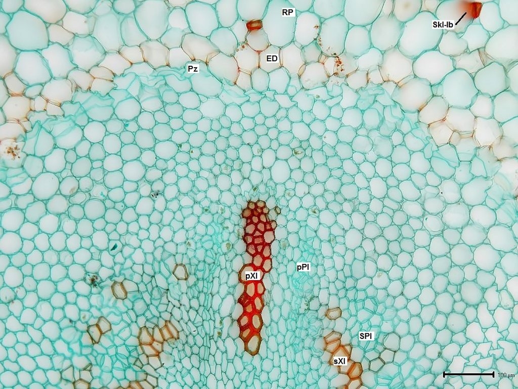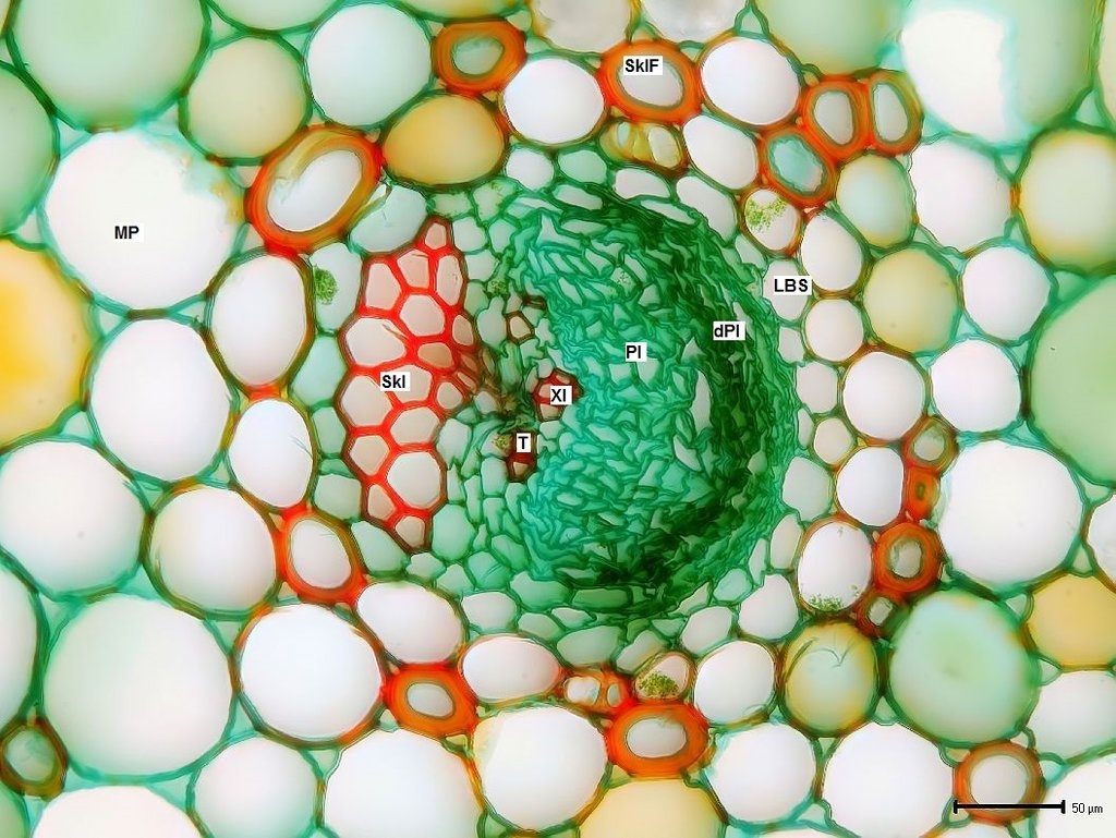 Auffällig sind hier die wenigen Tracheiden im Xylem und die obliterierten (unbrauchbaren) Siebelemente am Rand des Phloems  (dPl - disfunktionales Phloem). Die Leitbündelscheide ist gut zu erkennen und umschließt auf der Xylem-Seite auch eine Sklerenchymkappe. Am äußeren Rand der Leitbündelscheide finden wir einige Sklerenchymfasern, wie sie auch bei anderen Palmfarnen auftreten.