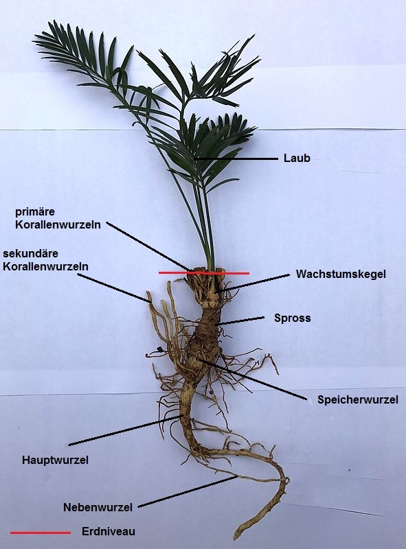 Die Abbildung zeigt die etwa zweijährige Pflanze mit ihren Wurzeln, die von einer im oberen Bereich stark verdickten Speicherwurzel abzweigen. Dazu gehören auch die sekundären Korallenwurzeln. Darauf folgt der auch noch unterirdisch gelegene Spross, der in der Wachstumszone endet, die nicht nur die juvenilen Blätter des Palmfarns sondern auch noch einen Kranz primärer Korallenwurzeln trägt. Das Erdniveau ist durch eine rote Linie gekennzeichnet.