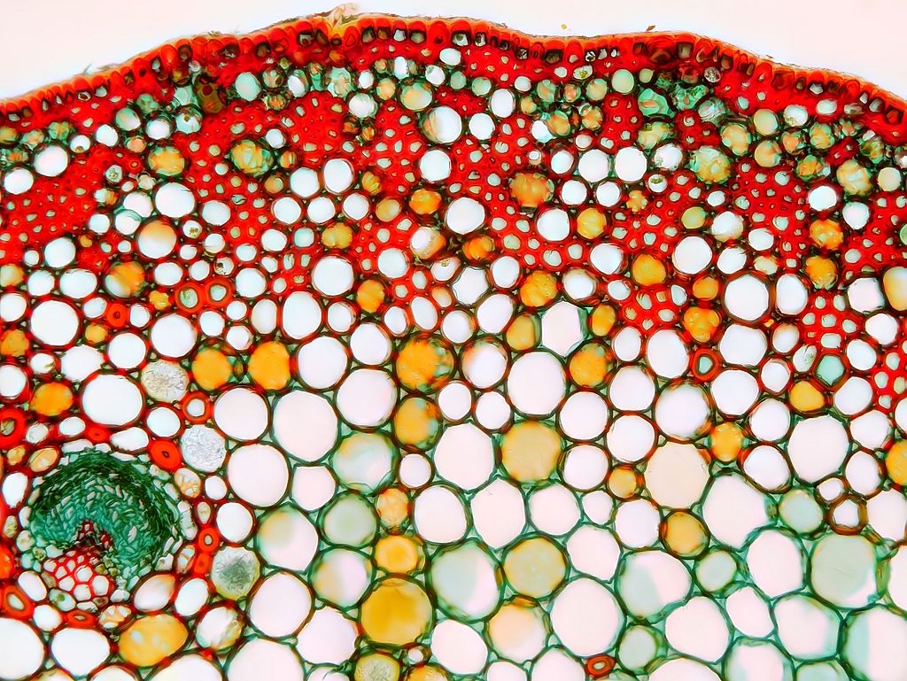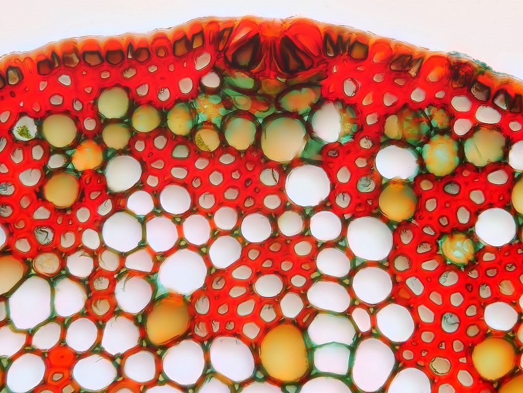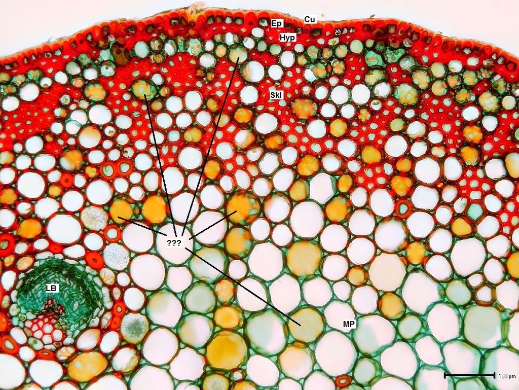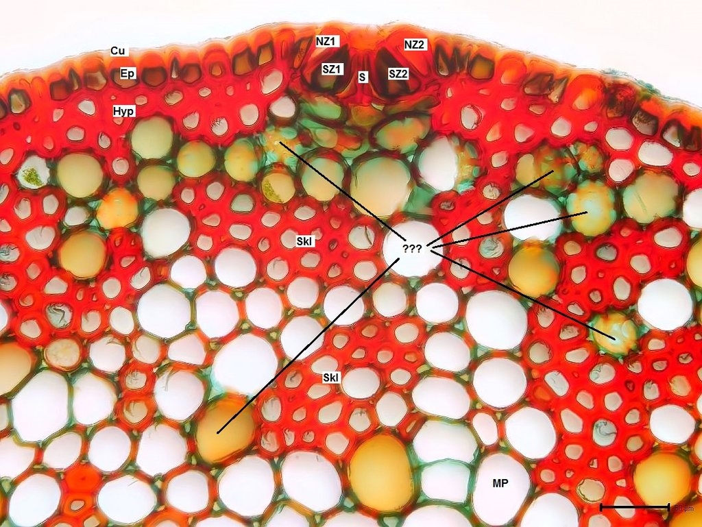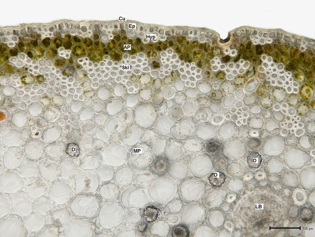 Unter der einreihigen Epidermis mit einer ausgeprägten Cuticula finden wir eine Hypodermis, die an einigen Stellen vom darunter liegenden Assimilationsparenchym unterbrochen ist. Darunter liegen größere Gruppen sklerenchymatischer Zellen zur Festigung, die allmählich in die Parenchymzellen des Marks über gehen. Ein Leitbündel hat es jeweils auch in die Aufnahmen geschafft. Zwischen den Leitbündeln liegen auch zwei Sekretgänge mit einem Drüsenepitel in Markparenchym (Abb. 23 c & d).
