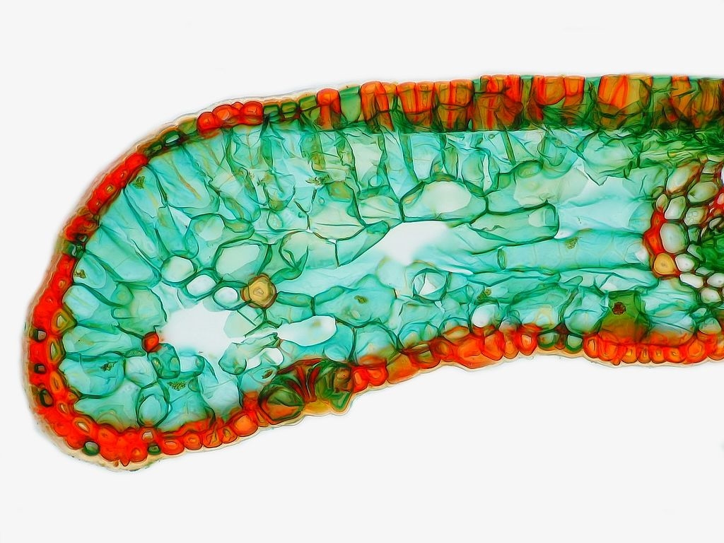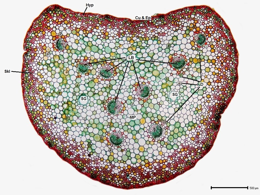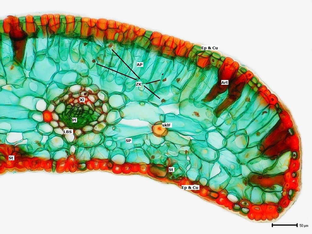 Die Lage der gleichförmigen Leitbündel mit ihrer Leitbündelscheide ist auch im frischen Schnitt gut zu erkennen. Das Assimilationsparenchym dagegen ist nur im frischen Schnitt eindeutig anhand der grünen Chloroplasten eindeutig auszumachen. Auffällig auch die vielen über den Querschnitt verteilten Calciumoxalat-Drusen.