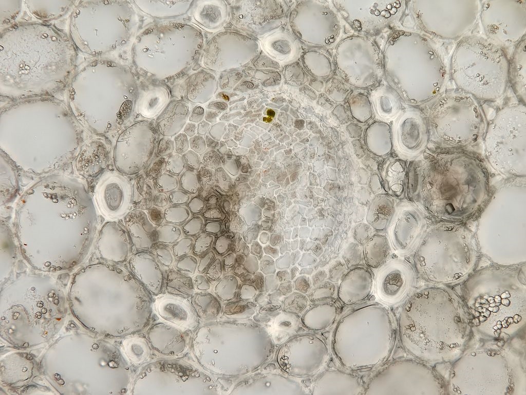 Geschnitten habe ich die Hauptwurzel unterhalb der Verdickung. Die Probe hat einen Durchmesser von etwa 4 Millimetern.
