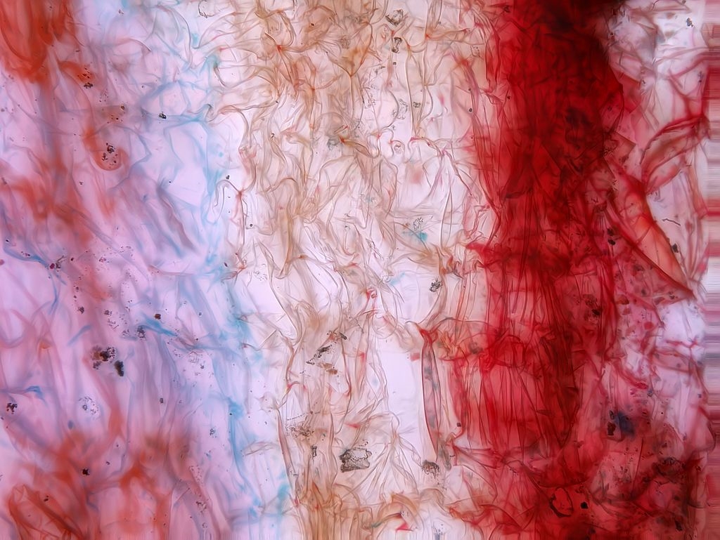 Diese ließen sich nach der Entwässerung mit Isopropanol nicht im ganzen eindecken, ich habe sie also in Segmente zerschnitten, um die Spannung aus dem Gewebe zu nehmen. Trotzdem ließen sich meine 50 mm Schnitte nicht wirklich plan eindecken, was zu einem sehr hohen Euparal-Einsatz und großen Luftblasen aufgrund der Schrumpfung des Harzes beim Trocknen geführt hat.