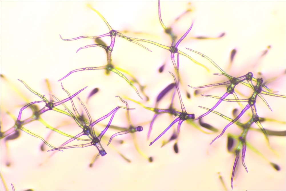 heute habe ich nun ein paar Aufnahmen von meinen Präparaten vom Sonntag gemacht. Es handelt sich um Schuppenhaare der Silber-Ölweide (Elaeagnus commutata), von denen ein Nachbar einige in seiner Hecke hat.