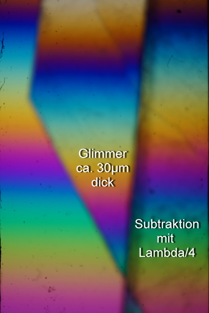 Der einfachste Weg gute λ oder λ/4 Kompensatoren selbst herzustellen ist tatsächlich mit Glimmerplättchen. Bei den dickeren λ-Platten stört aber evtl. die bräunliche Eigenfärbung des Muskovits. Auch braucht man eine hervoragende Qualität des Glimmers und das Spalten verlangt einige Übung. Die richtige Dicke bestimmt man entweder mit einem vorhandenen Kompensator in Subtraktionsstellung - die sollten sich gegenseitig zu schwarz kompensieren - oder mit einem Meßkompensator z.B. nach Berek.