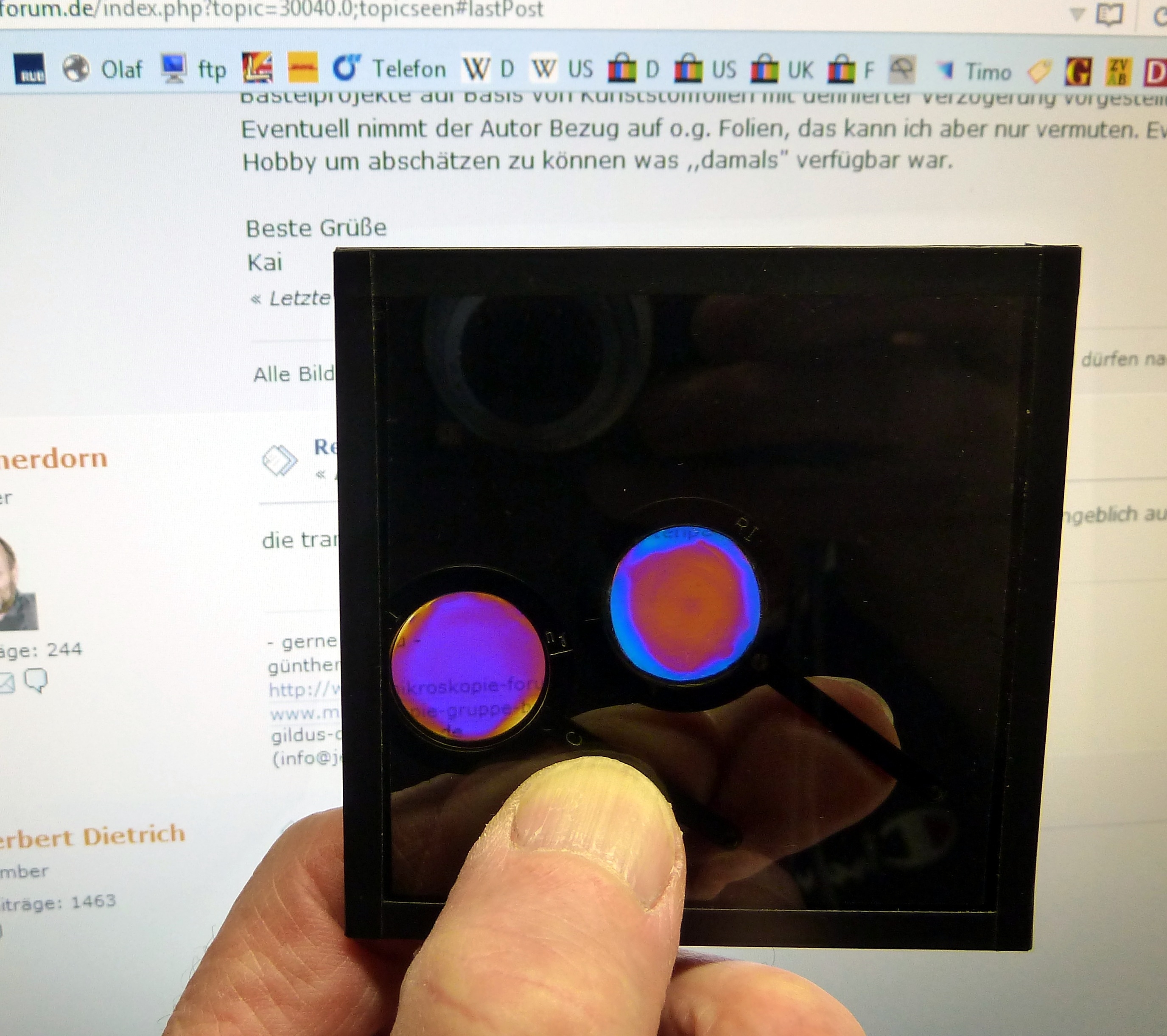Plastikfolien reichen für "Spielereien" bzw. künstlersich-ästhetische Farbefeffekte aus, aber sicher nicht für ernsthafte Anwedungen in der Polmikroskope. Falls Olaf diese Therad übersieht, mail ihn einfach mal an. Wenn es Lösungen im Bereich der Polmikroskopie gibt - Olaf kennt sie! Und wenn sie Olaf nicht kennt, kennt sie niemand.