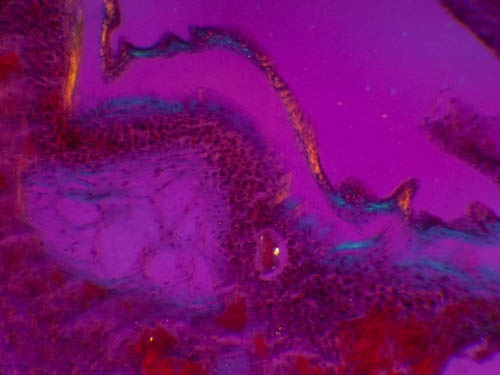 Olaf hat mich mit Glimmer und etwas Polfolie versorgt. Mit der Polarisationsfolie vor mir konnte ich nicht widerstehen mein Biolam-I zu polarisieren und damit zeitweise in die Spielerei abzugleiten: