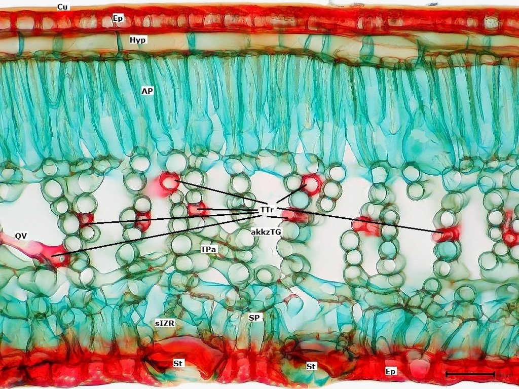 Wir sehen ein bifaziales Blatt mit einem ein- bis mehrreihigen Assimilationsparenchym an der Blattoberseite, darunter ein umfangreiches Schwammparenchym, in dem die von einer Leitbündelscheide umschlossenen Leitgewebe liegen. Das ganze ist umgeben von einer Epidermis mit recht dicker Cuticula, unter der eine einreihige, sklerenchymatische Hypodermis liegt, deren Zellen am Blattrand deutlich vergrößert sind.