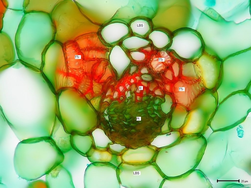 Nun also zu den Transfusionstracheiden. Bei diesen handelt es sich um sklerenchymatische, also abgestorbene Zellen mit großen Hoftüpfeln in den Zellwänden. Wie der Name schon andeutet, dienen Sie dem Wassertransport im Gewebe und stellen so quasi eine Vorstufe der Tracheiden und Tracheen in den Leitbündeln da. Sie werden in aller Regel von einem Transfusionsparenchym begleitet, das auch hier vorhanden ist, dessen Zellen sich aber im Präparat nicht bzw. nur sehr schwer von denen der Leitbündelscheide unterscheiden lassen. Daher habe ich es in den vorliegenden Bildern auch nicht benannt.