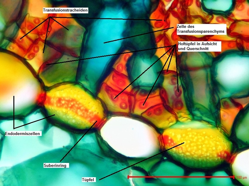 Die großen Hoftüpfel sind besonders in den parallel zur Schnittebene liegenden Zellwänden gut zu erkennen, Weiterhin sehen wir in der Mitte der Zellgruppe eine Zelle mit nicht sklerifizierten, also grünen, Zellwänden.