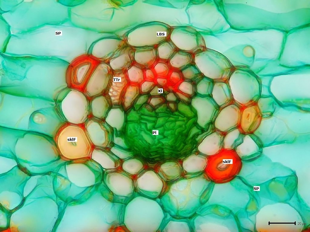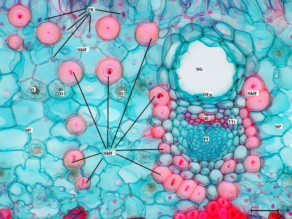 Neben den bereits oben angesprochenen Details erkennen wir nun auch im Schwammparenchym eingelagerte Faserbündel (sklF) und die beidseitig neben dem mittig angeordneten Xylem (oben) und Phloem (unten) liegende Transfusionstracheiden besser als in der Übersichtsaufnahme.